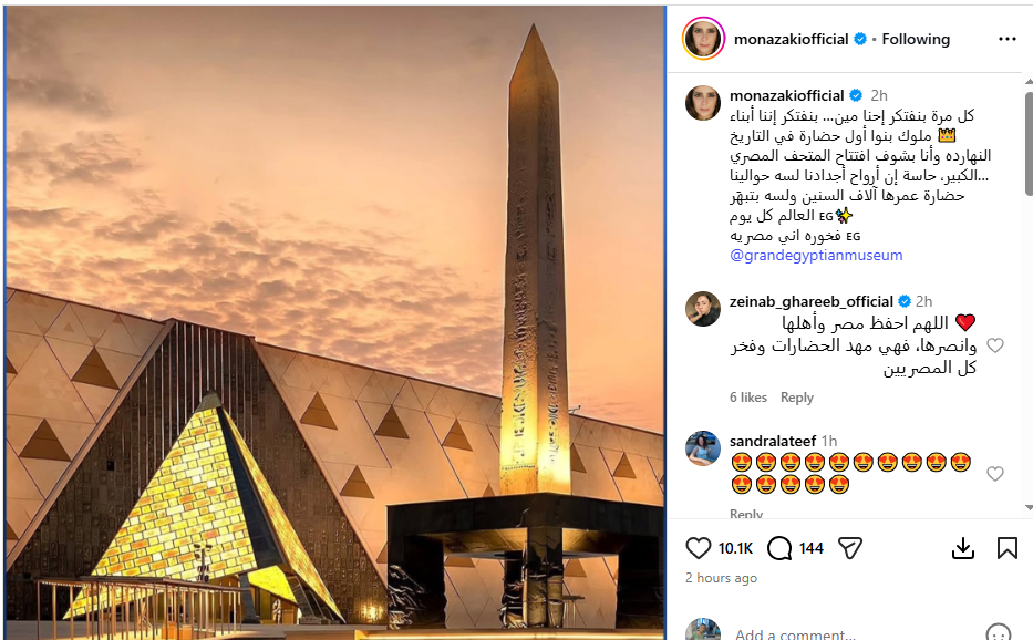 احتفلت النجمة منى زكى بالمتحف الكبير ، والذى انتهى منذ قليل امام اعين العالم كله، حيث نشرت عبر صفحتها الشخصية على موقع انستجرام قائلة: كل مرة بنفتكر إحنا مين… بنفتكر إننا أبناء ملوك بنوا أول حضارة في التاريخ ‏النهارده وأنا بشوف افتتاح المتحف المصري الكبير، حاسة إن أرواح أجدادنا لسه حوالينا… ‏حضارة عمرها آلاف السنين ولسه بتبهَر العالم كل يوم فخورة إني مصرية