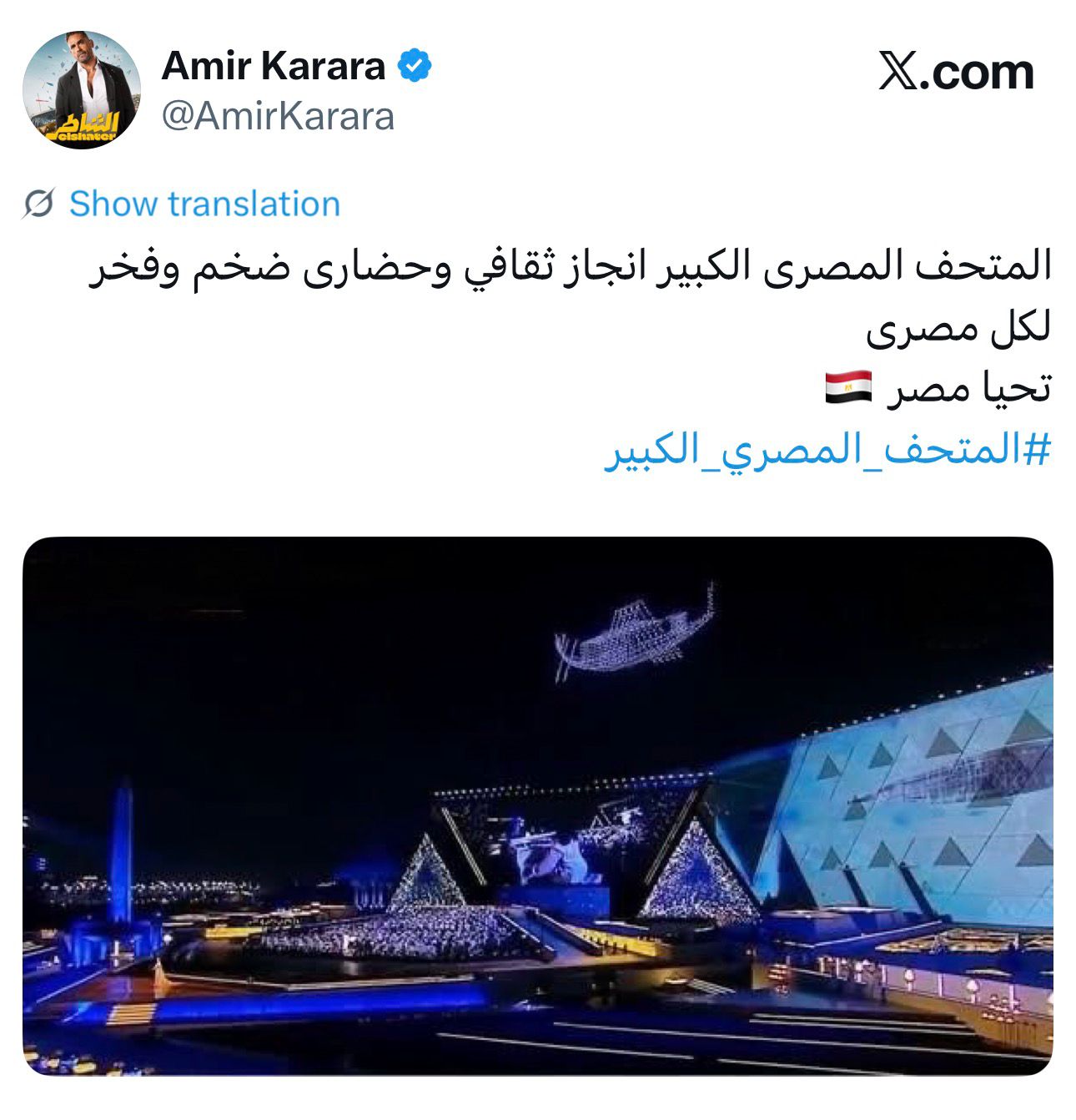عبر النجم أمير كرارة عن اعتزازه بافتتاح المتحف الكبير ، الذى أقيم منذ قليل وسط حضور الرئيس السيسى وعدد من ملوك ورؤساء العالم، حيث كتب عبر صفحته الشخصية على تويتر قائلا: المتحف الكبير إنجاز حضارى وثقافى ضخم وفخر لكل مصري.