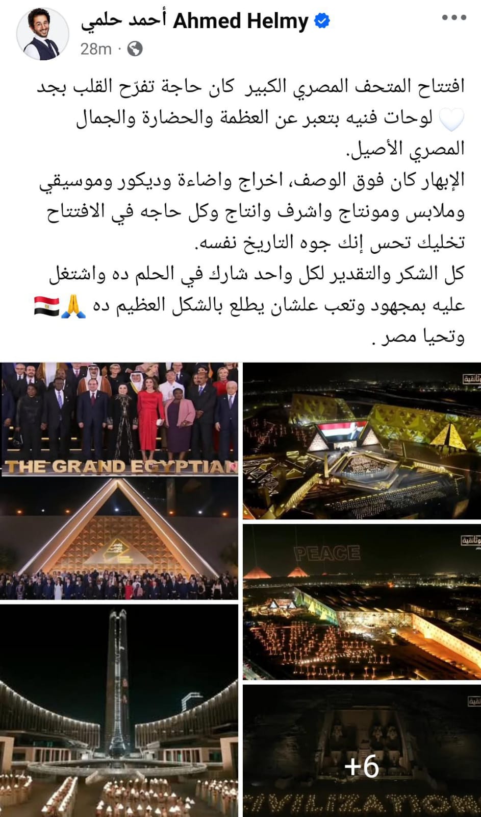 علق النجم أحمد حلمي من خلال صفحته على موقع فيس بوك على افتتاح المتحف المصري الكبير، قائلا، "افتتاح المتحف المصري الكبير كان حاجة تفرّح القلب بجد لوحات فنيه بتعبر عن العظمة والحضارة والجمال المصري الأصيل".