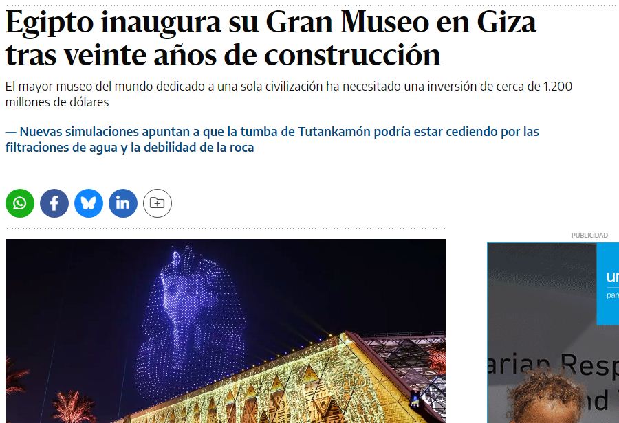 سلطت صحيفة الدياريو الإسبانية الضوء على افتتاح المتحف المصرى الكبير ، قائلة إن الحفل أبهر العالم من الموسيقى للعروض الضوئية التى أبهرت الحضور على خلفية الأهرامات المهيبة بالجيزة ،مشيرة إلى أن المتحف المصرى الكبير يعد جسر الفراعنة ومستقبل السلام.