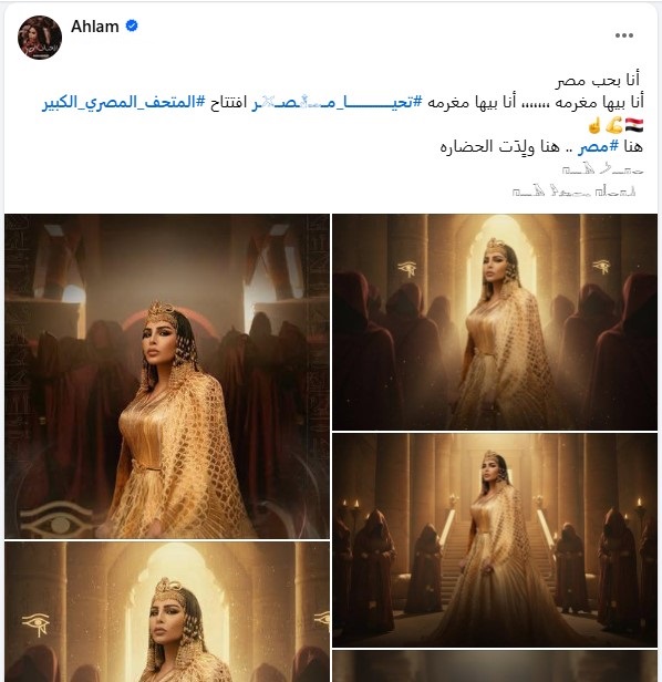 اختصرت النجمة الإماراتية أحلام حالة الفرحة والاحتفاء العالمى والعربي بها، لافتتاح المتحف المصري الكبير على أرض في كلمة واحد.. "أنا بحب مصر.. أنا بيها مغرمة.. أنا بيها مغرمة"، وهو ما وجد صدى واسع لدى متابيعها على صفحتها على فيس بوك، حيث نشرت صورة لها وفى خلفيتها تمثال لملك مصري قديم بحجم كبير، تحيطه أعمدة وأجواء فرعونية، وقد أثنى المصريون والمتابعون لها عبر التعليقات على هذه العلاقة، مؤكدين أن المصريين يحبون من يحبهم بهذا الشكل وهذه الصورة.
