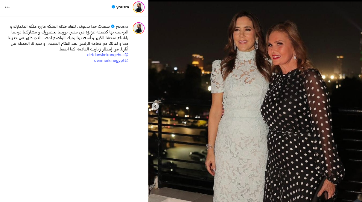 ونشرت يسرا عبر حسابها على إنستجرام صورا من لقائها بملكة الدنمارك، صحبتها بالقول: "سعدت جدا بدعوتى للقاء جلالة الملكة مارى ملكة الدنمارك والترحيب بها كضيفة عزيزة فى مصر، نورتينا بحضورك ومشاركتنا فرحتنا بافتتاح متحفنا الكبير".