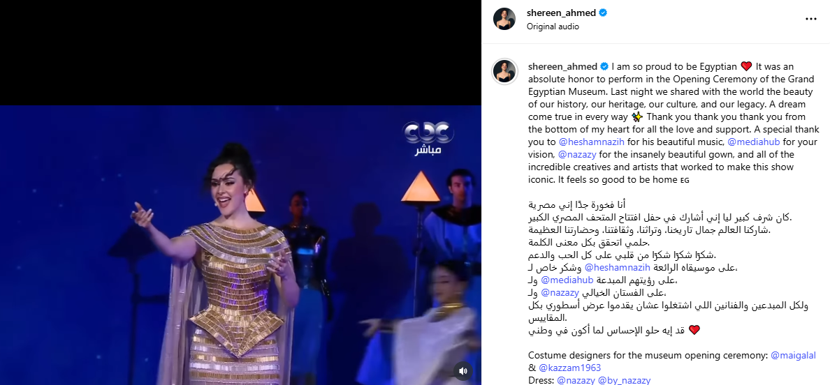 وقالت شيرين، عبر حسابها على انستجرام: "أنا فخورة جدًا إني مصرية، كان شرف كبير ليا إني أشارك في حفل افتتاح المتحف المصري الكبير، شاركنا العالم جمال تاريخنا، وتراثنا، وثقافتنا وحضارتنا العظيمة، حلمي اتحقق بكل معنى الكلمة".