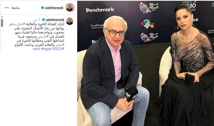 وكتب ربيع هنيدي عبر حسابه الرسمي بموقع "انستجرام": "أبارك للفنانة الكبيرة والغالية آمال ماهر زواجها من رجل الأعمال المصري علي محجوب وتواجدهما حاليا لقضاء شهر العسل في باريس، وستعود قريبا لنشاطها الفني وحفلاتها الكبيرة في مصر والعالم العربي ودامت الأفراح".