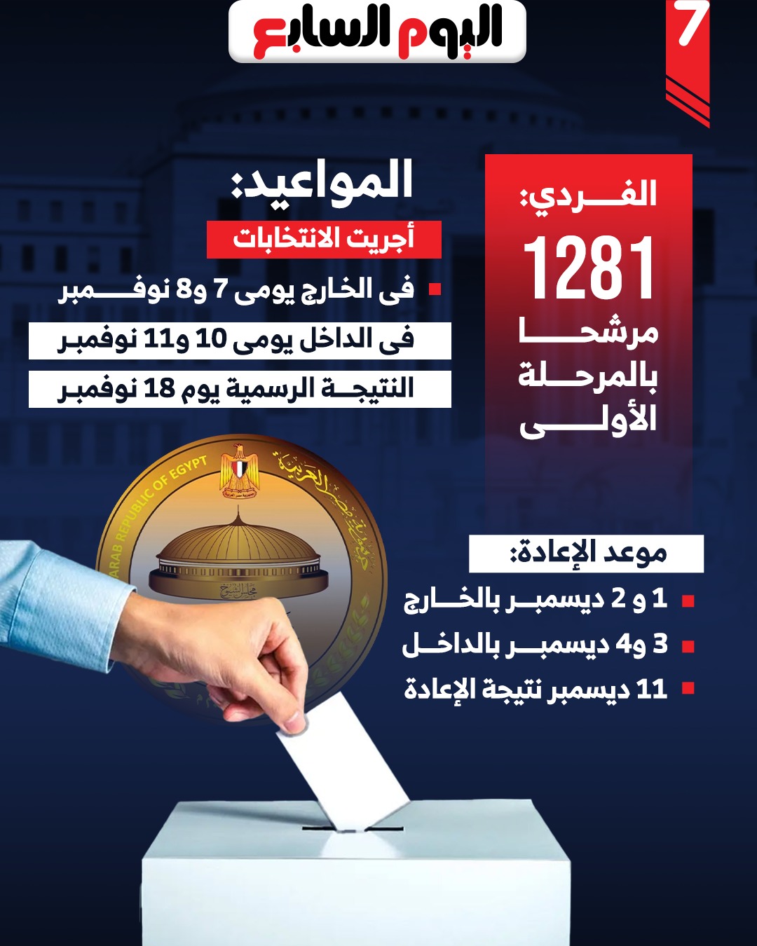 - أجريت الانتخابات في الخارج يومى 7 و8 نوفمبر