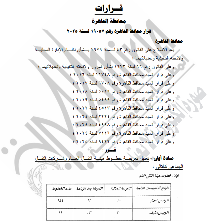 نشرت الجريدة الرسمية فى عددها اليوم قرار الدكتور إبراهيم صابر محافظ القاهرة بتعديل تعريفة ركوب سيارات النقل الجماعى والعام وذلك ضمن تعديل أجرة تعريفة ركوب سيارات الأجرة، فى ضوء صدور قرار تعديل سعر البنزين والسولار الأخير .