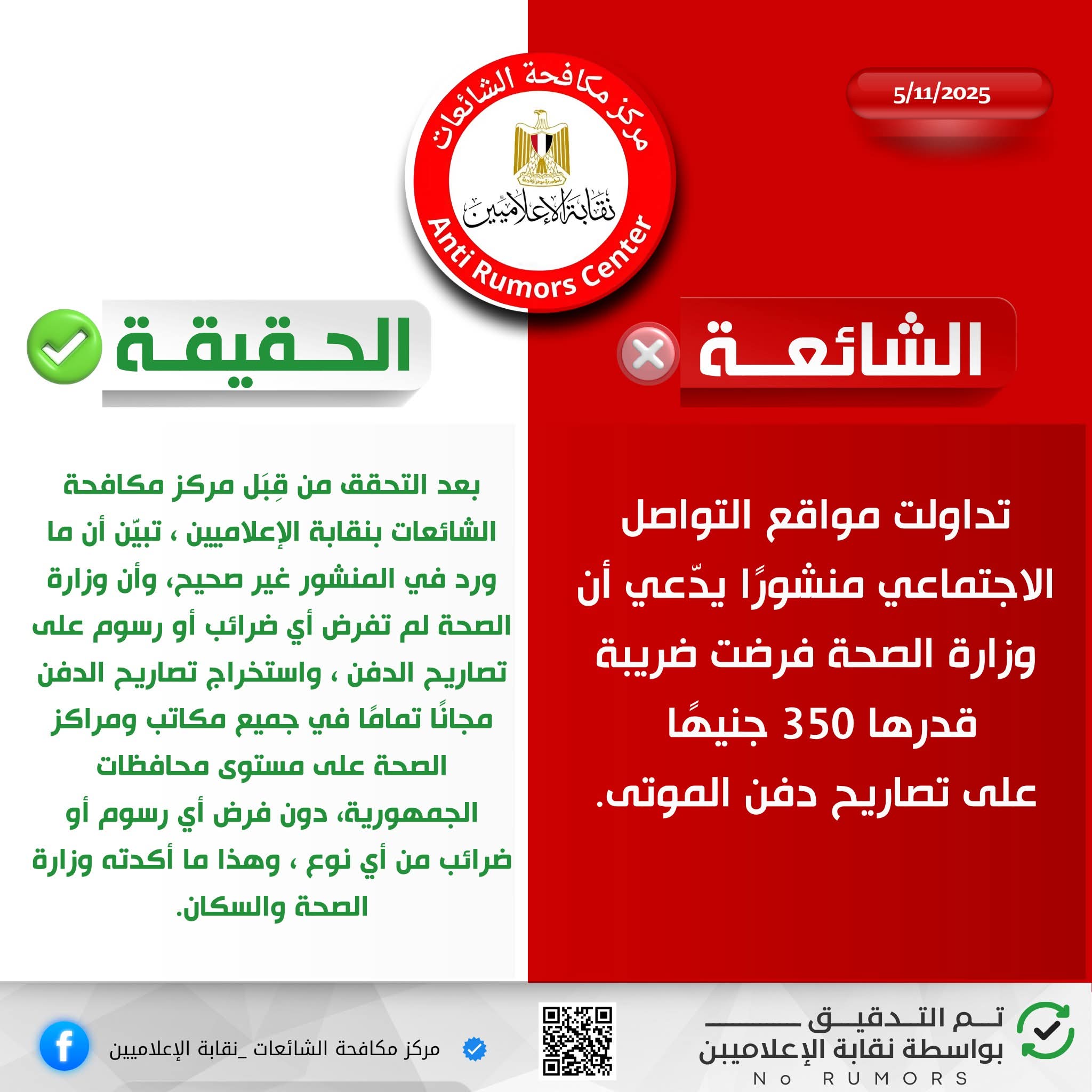 نفى مركز مكافحة الشائعات التابع لنقابة الإعلاميين برئاسة الدكتور طارق سعده، نقيب الإعلاميين، ما تداوله بعض حسابات على مواقع وسائل التواصل الاجتماعي من منشور يدّعي أن وزارة الصحة فرضت ضريبة قدرها 350 جنيهًا على تصاريح دفن الموتى.