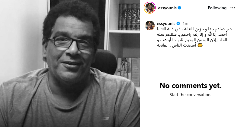 وقالت إسعاد، عبر حسابها على إنستجرام: خبر صادم جدا وحزين للغاية، في ذمة الله يا أحمد، إنا لله وإنا إليه راجعون، فلتنعم بجنة الخلد بإذن الرحمن الرحيم قدر ما أبدعت وأسعدت الناس.