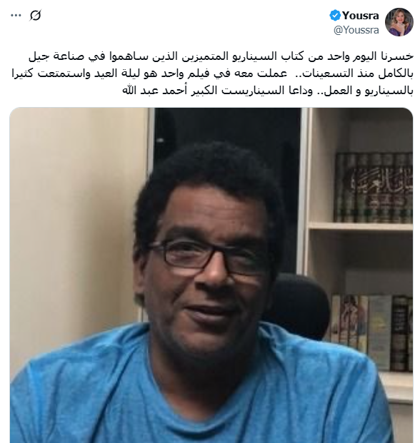أعربت النجمة الكبيرة يسرا عن حزنها الشديد لوفاة الكاتب والسيناريست أحمد عبد الله ، مؤكدة أنه واحد من كتاب السيناريو المتميزين الذين ساهموا في صناعة جيل بالكامل منذ التسعينيات.