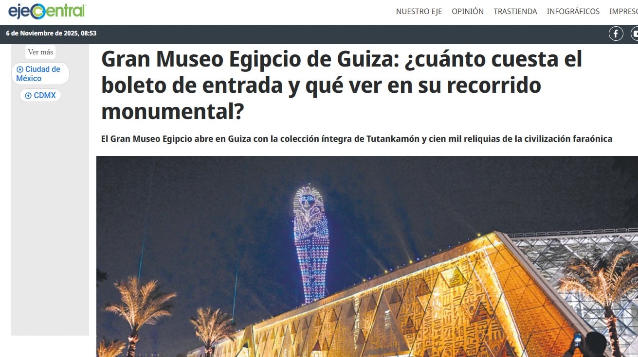 سلطت صحيفة إيخى ثينترال المكسيكية الضوء على المتحف المصرى الكبير ، وقالت إنه أضخم صرح أثرى فى العالم لحضارة واحدة، وبموقعه المذهل بجوار أهرامات الجيزة ، حيث يقدم المتحف تجربة غامرة تجمع بين العراقة والحداثة ، ويعرف عالميا باسم الهرم الرابع بسبب تصميمه المهيب الذي يجمع بين الزجاج والحجر في تناغم بصري يأسر الأنظار.
