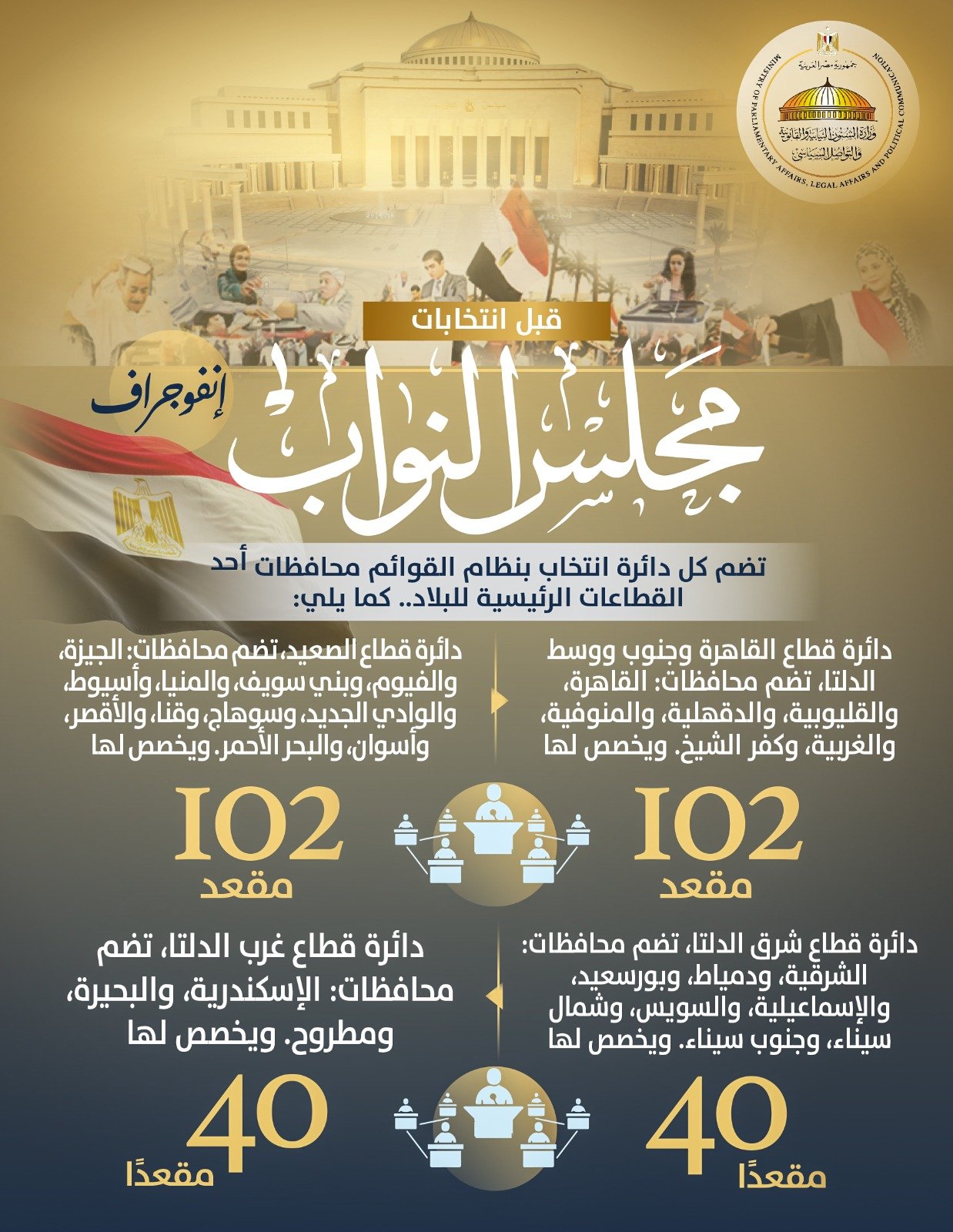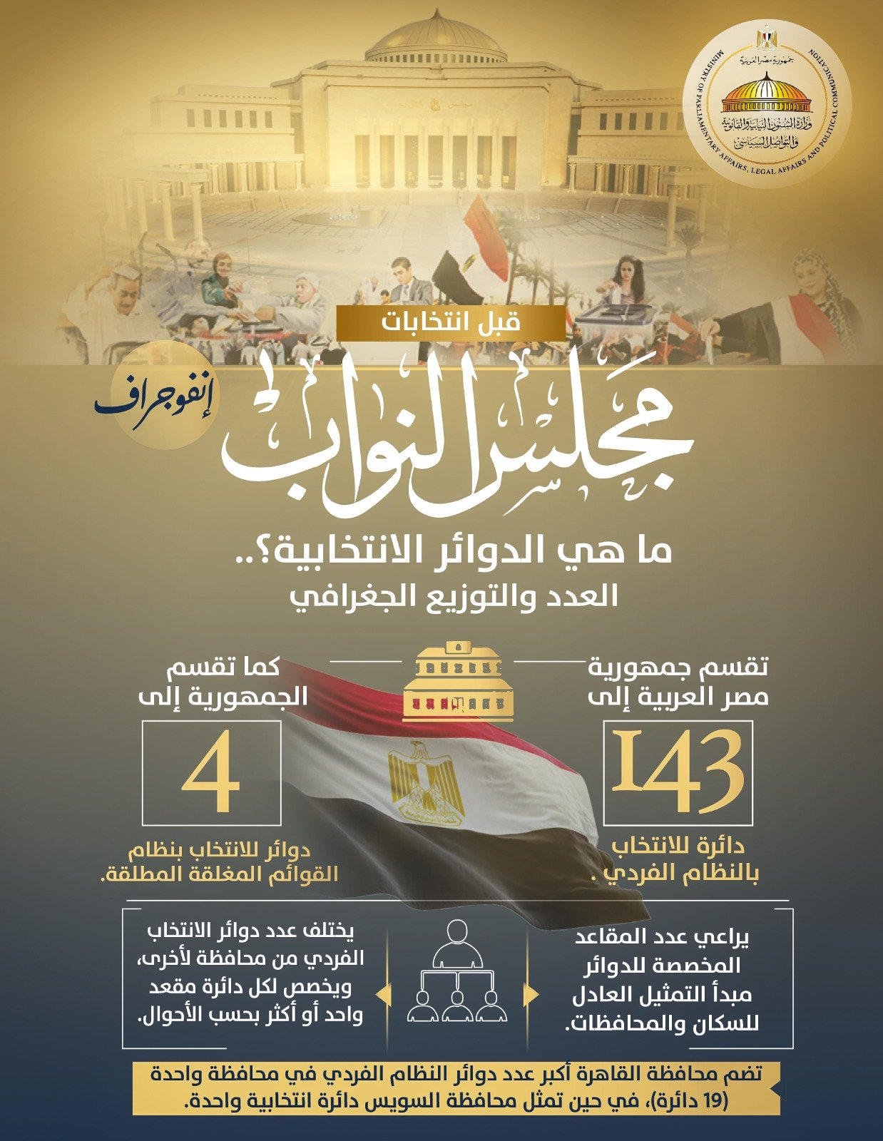 مع اقتراب بدء عملية التصويت في انتخابات مجلس النواب 2025 ، والتي تنطلق في مرحلتها الأولي للمصريين بالخارج يومي الجمعة والسبت الموافقين 7 و 8 نوفمبر الجاري، ويومي 10 و11 نوفمبر للمصريين بالداخل، نشرت وزارة الشؤون النيابية والقانونية والتواصل السياسي إنفوجرافًا جديدًا يتضمّن كافة المعلومات المتعلقة ب الدوائر الانتخابية ، من حيث عددها وتوزيعها الجغرافي، وذلك في إطار استمرار جهودها لزيادة الوعي الانتخابي وتفعيل جانب التواصل السياسي مع المواطنين.