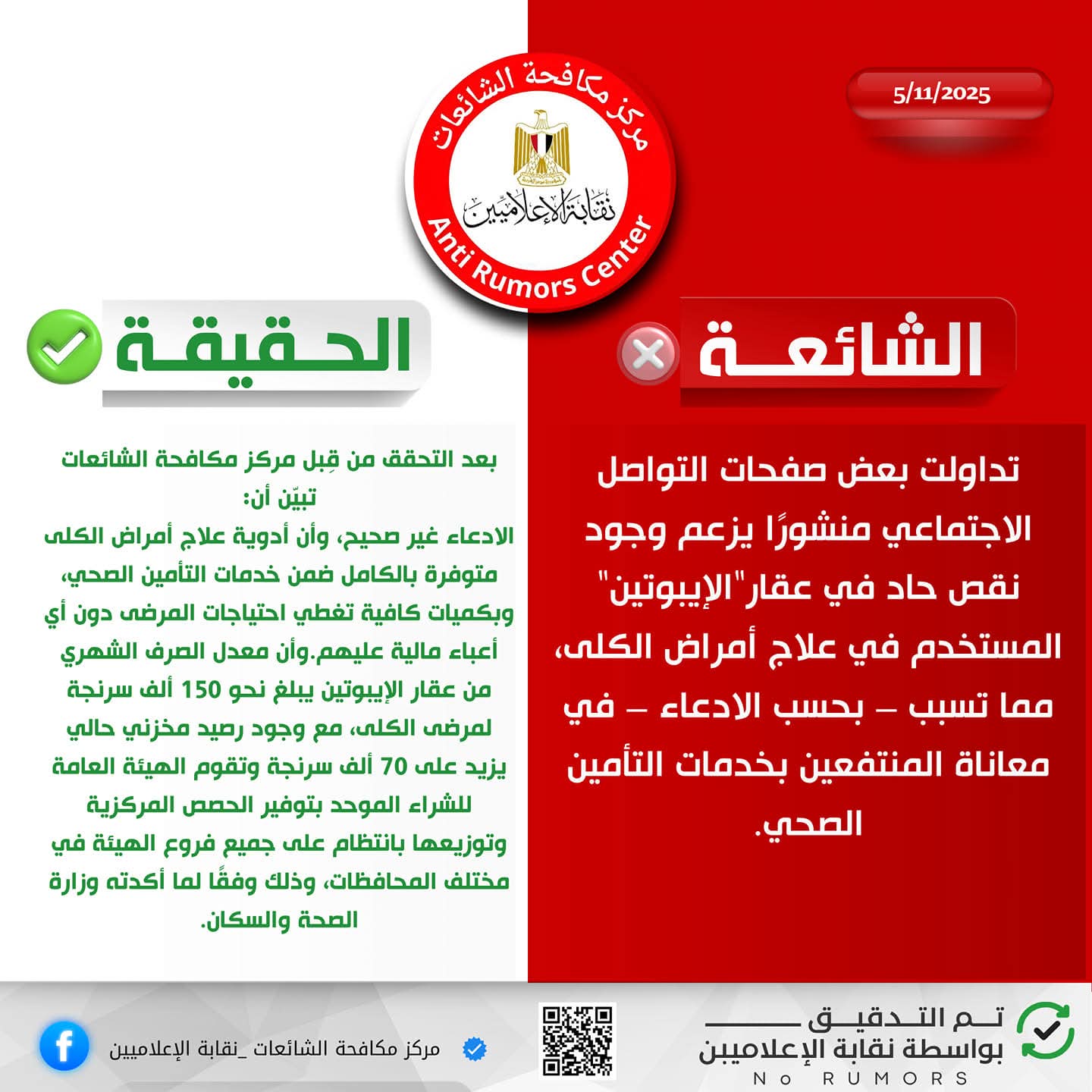 و بعد التحقق من قِبل مركز مكافحة الشائعات بنقابة الإعلاميين، تبين أن هذا الادعاء غير صحيح ، وأن أدوية علاج أمراض الكلى متوفرة بالكامل ضمن خدمات التأمين الصحي، وبكميات كافية تغطي احتياجات المرضى دون أي أعباء مالية عليهم ، وأن معدل الصرف الشهري من عقار الإيبوتين يبلغ نحو 150 ألف سرنجة لمرضى الكلى، مع وجود رصيد مخزني حالي يزيد على 70 ألف سرنجة.