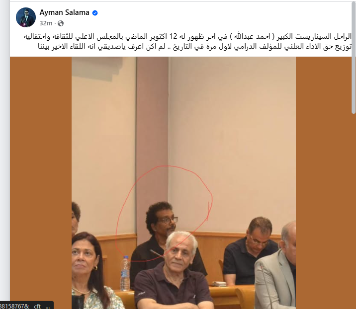 شارك المؤلف أيمن سلامة متابعيه على موقع فيس بوك بصورة لصديقه الكاتب والسيناريست الراحل أحمد عبد الله، وهي الصورة الذى علق عليها بكتابة : " الراحل السيناريست الكبير ( احمد عبدالله ) في آخر ظهور له 12 أكتوبر الماضي بالمجلس الأعلي للثقافة واحتفالية توزيع حق الآداء العلني للمؤلف الدرامي لأول مرة في التاريخ .. لم أكن اعرف ياصديقي أنه اللقاء الاخير بيننا".