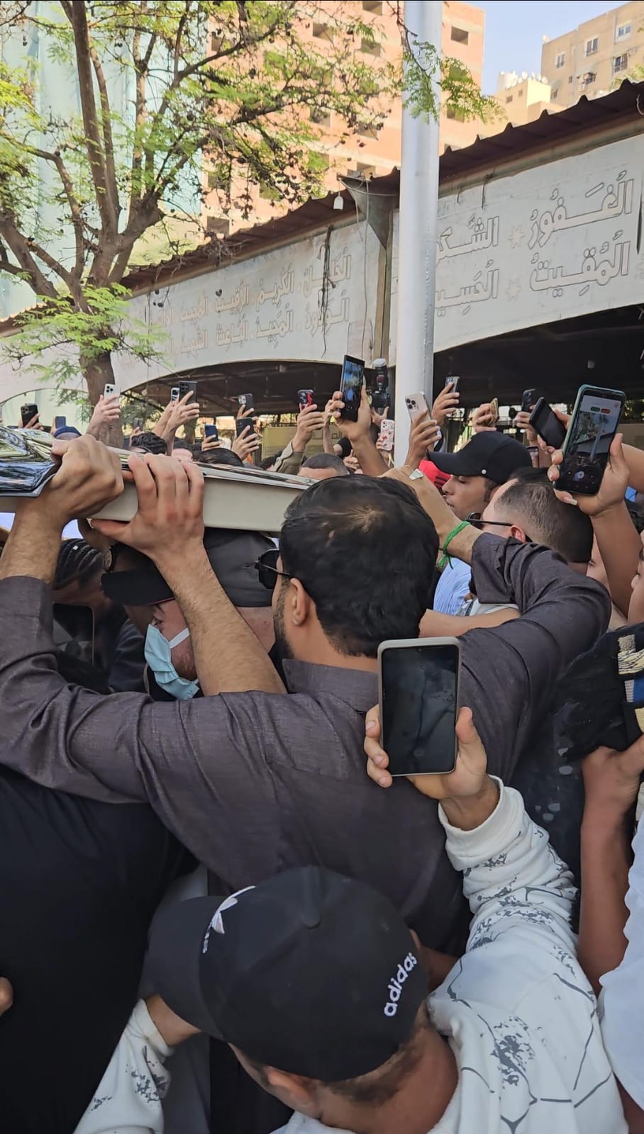 انهار الفنان محمد رمضان بجوار جثمان والده داخل مسجد مصطفي محمود بمنطقة المهندسين، حيث سيؤدي صلاة الجنازة عليه ويشيعه الي مثواه الأخير بمقابر الأسرة بمدينة 6 أكتوبر، كما وصلت زوجته إلى المسجد لأداء الصلاة على والد زوجها.