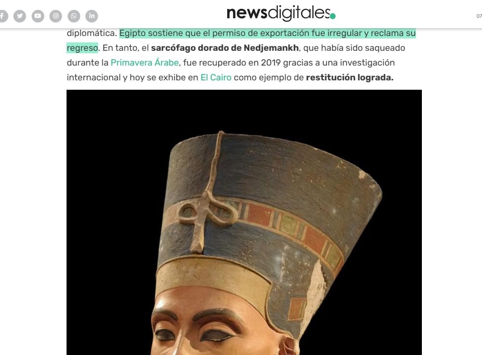 قالت صحيفة نيوز ديجيتال الإسبانية إن افتتاح المتحف المصرى الكبير أحى الأمال من جديدة باستعادة القطع الأثرية المنهوبة ، حيث استعادت مصر أكثر من 36 قطعة مؤخرا ، وهو ما يفتح الجدل من جديد بعودة تمثال نفرتيتى، رمز الجمال والغموض ، من بين التماثيل والقطع الأثرية التي بدأت مصر فى استعادتها مرة آخرى.