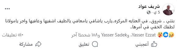 وكتب شريف عواد عبر حسابه على "فيس بوك": "يارب في هذا اليوم المبارك.. اشفي بنتي شروق.. يا قادر على كل شيء".
