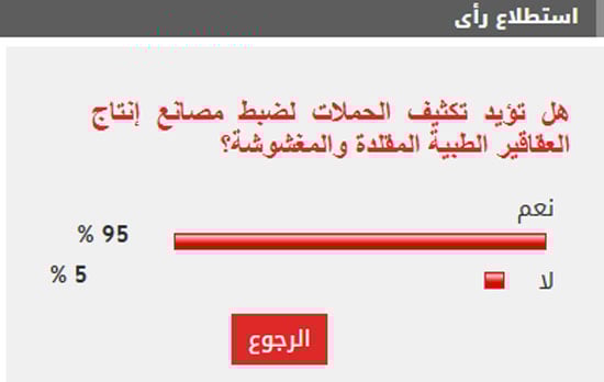 وأيد 95% من القراء مطالب تكثيف الحملات لضبط مصانع إنتاج العقاقير الطبية المقلدة والمغشوشة، بينما رفض 5% مطالب تكثيف الحملات لضبط مصانع إنتاج العقاقير الطبية المقلدة والمغشوشة.