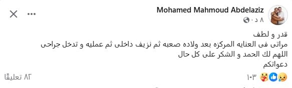 وكتب محمد محمود عبد العزيز عبر حسابه على "فيسبوك": "قدر ولطف، مراتى فى العناية المركزة بعد ولادة صعبه ثم نزيف داخلى ثم عملية وتدخل جراحى، اللهم لك الحمد والشكر على كل حال، دعواتكم".