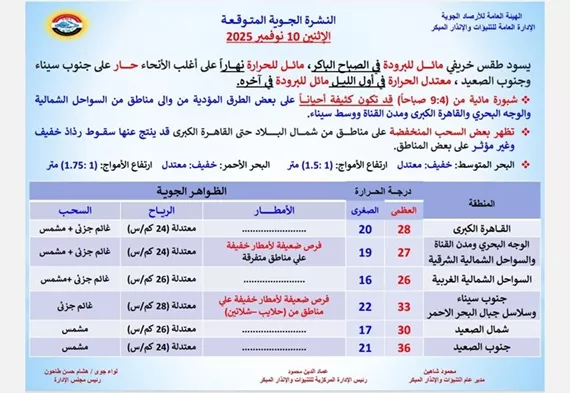 وقالت الهيئة إن البلاد ستشهد طقس مائل للبرودة في الصباح الباكر وأول الليل، بينما يميل للحرارة خلال ساعات النهار على معظم المناطق، ويصبح حارًا على جنوب سيناء وجنوب الصعيد.
