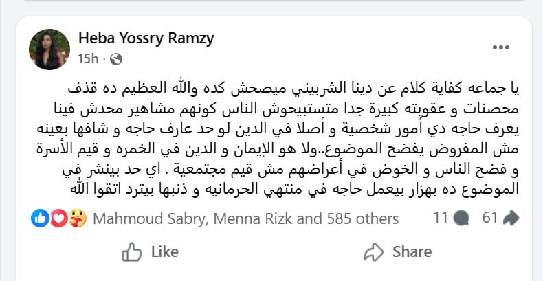 ونشرت المخرجة هبة يسرى عبر حسابها على موقع فيس بوك، منشوراً حذرت فيه من الخوض فى الحياة الشخصية للفنانين، مؤكدة أن ما يحدث يعد تجريحاً وقذفاً للمحصنات يعاقب عليه القانون والدين، وكتبت يسرى قائلة:"يا جماعة كفاية كلام عن دينا الشربينى، ميصحش كده والله العظيم، ده قذف محصنات وعقوبته كبيرة جداً، متستبيحوش الناس كونهم مشاهير، محدش فينا يعرف حاجة، دي أمور شخصية".