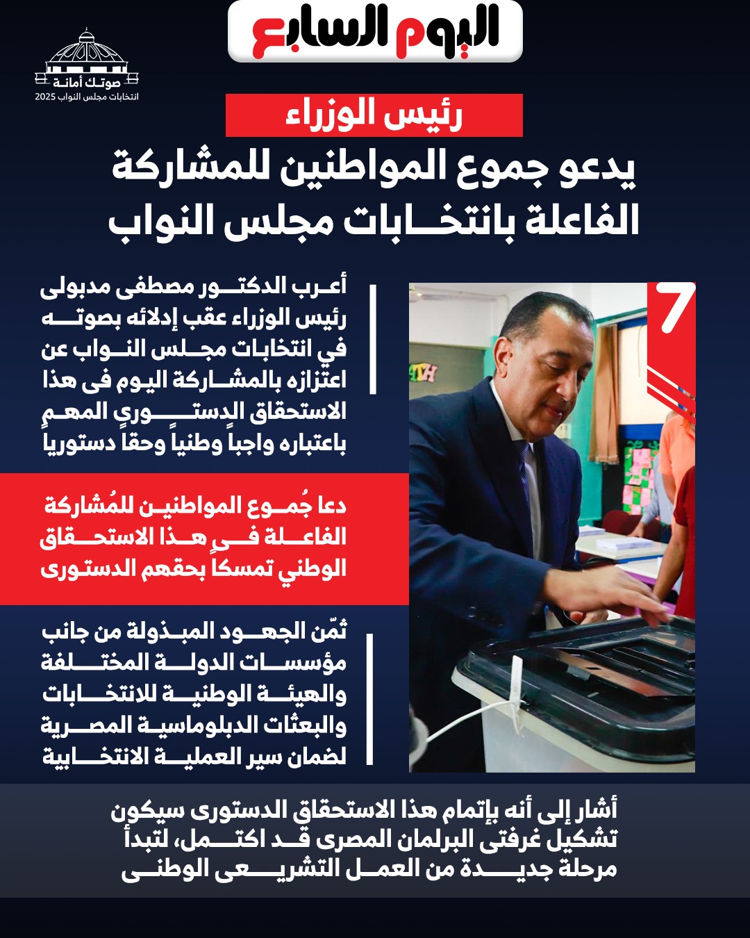 وعقب الإدلاء بصوته، أعرب الدكتور مصطفى مدبولي عن اعتزازه بالمشاركة اليوم في هذا الاستحقاق الدستوري المهم، باعتباره واجباً وطنياً وحقاً دستورياً، داعياً جُموع المواطنين للمُشاركة الفاعلة في هذا الاستحقاق الوطني، تمسكاً بحقهم الدستوري، ولمواصلة دورهم في المُساهمة الايجابية تجاه بناء مؤسسات الوطن، ودعم مسيرته لتحقيق التنمية المنشودة، خاصة بعد ما شهده التصويت في الخارج بالمرحلة الأولى من إقبال كبير لأبناء مصر.
