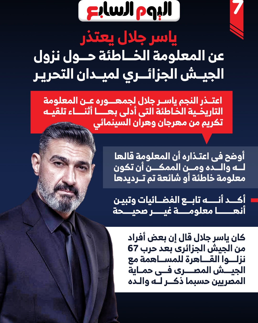 ياسر جلال يعتذر عن المعلومة الخاطئة حول نزول الجيش الجزائرى لميدان التحرير.. إنفوجراف