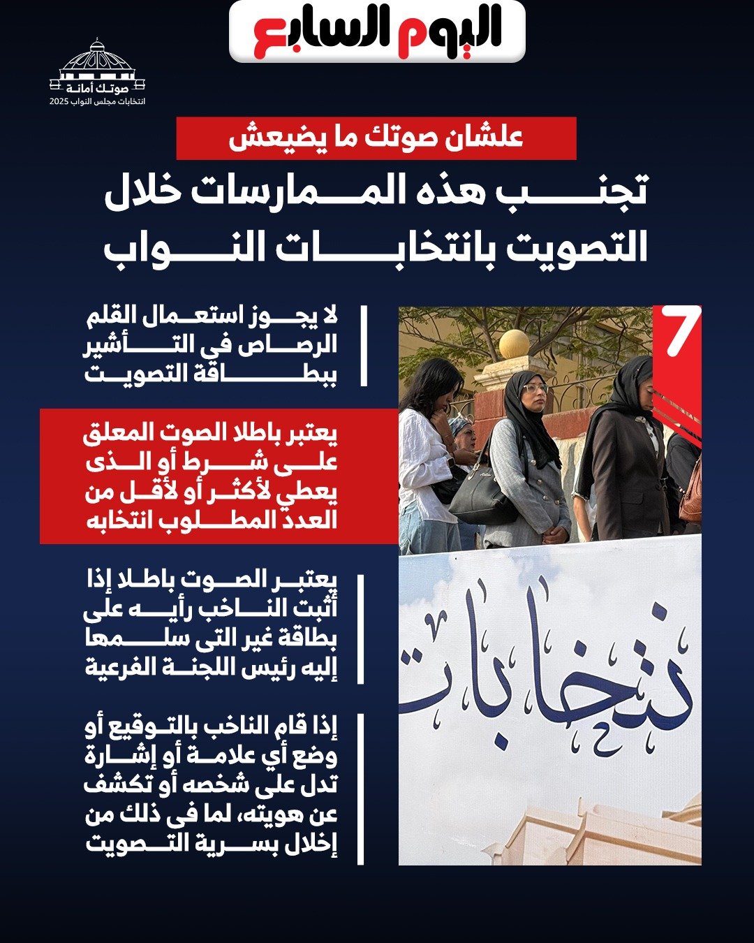 حددت الهيئة الوطنية للانتخابات ، عدة ممارسات ممنوعة لتجنب إبطال الصوت الانتخابي بانتخابات مجلس النواب، وأعدت "اليوم السابع" انفوجراف لعرض هذه الممارسات، وجاءت كالتالي: