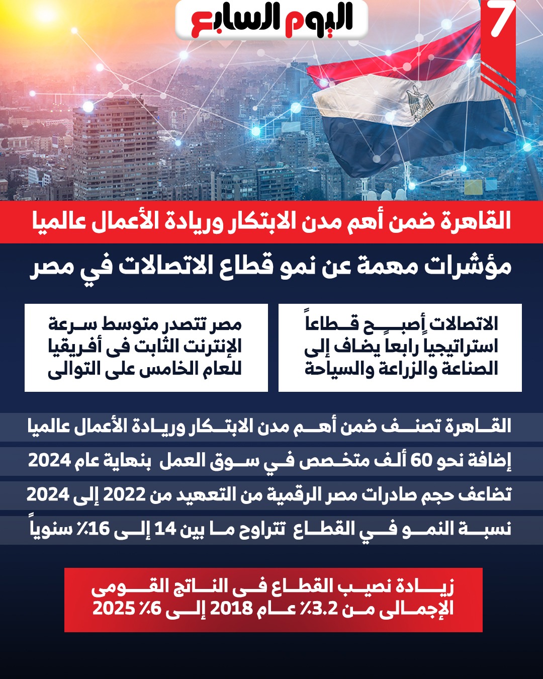 وأوضح الوزير أن الدولة تقوم بكل ما يلزم من إجراءات لتشجيع الشركات العالمية المتخصصة في مجال الاتصالات وتكنولوجيا المعلومات العاملة في مصر على توسيع نطاق عملها وفتح أسواق جديدة لها، بما في ذلك من خلال تقديم حوافز تشجيعية تشمل دعم التدريب والتعيين ورد الأعباء التصديرية، موضحاً أنه تم إضافة نحو 60 ألف متخصص في سوق العمل في هذا التخصص ذي الصلة بنهاية عام 2024، كما تضاعف حجم صادرات مصر الرقمية من التعهيد خلال الفترة من 2022 إلى 2024، موضحاً أن نسبة النمو في قطاع الاتصالات وتكنولوجيا المعلومات تتراوح ما بين 14 إلى 16٪ سنوياً، مما أدى إلى زيادة نصيب قطاع الاتصالات وتكنولوجيا المعلومات في الناتج القومي الإجمالي من 3.2٪ عام 2018إلى 6٪ في عام 2025، فضلا عن تضاعف الصادرات الرقمية في قطاع التعهيد، وأن مصر تتصدر متوسط سرعة الإنترنت الثابت في أفريقيا للعام الخامس على التوالي، وأن القاهرة تصنف ضمن أهم مدن الابتكار وريادة الأعمال عالميا.