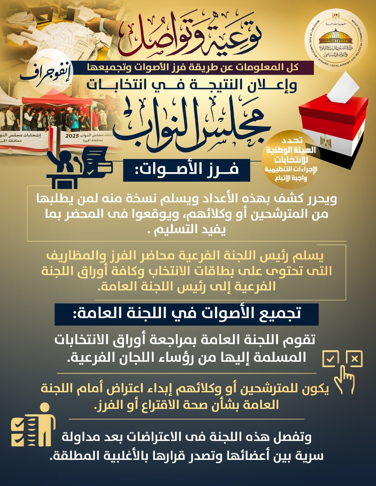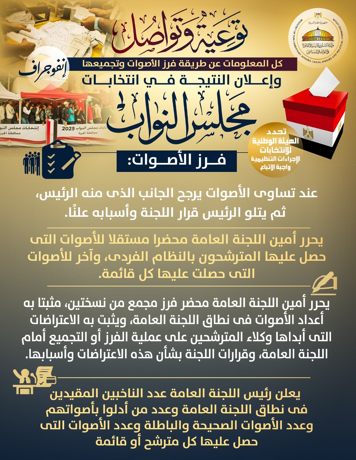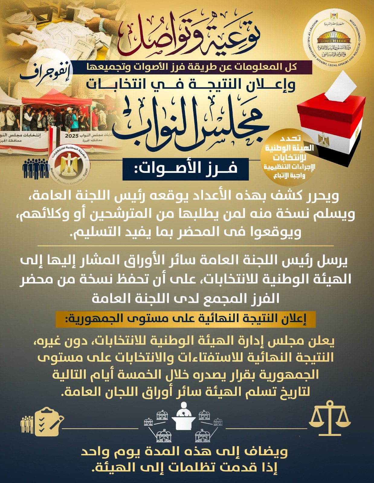 أصدرت وزارة الشؤون النيابية والقانونية والتواصل السياسي بيانًا اليوم الثلاثاء 11 نوفمبر 2025، قالت فيه إنه استمرارًا لسلسلة المحتوى التوعوي الذي بدأته الوزارة تحت شعار "توعية وتواصل"، نشرت اليوم مجموعة إنفوجرافات سياسية توعوية قدمت فيها معلومات بشأن كل ما يتعلق بعمليات فرز الأصوات، وذلك بالتزامن مع بدء اليوم الثاني والأخير في انتخابات المرحلة الأولى، لمجلس النواب 2025 .