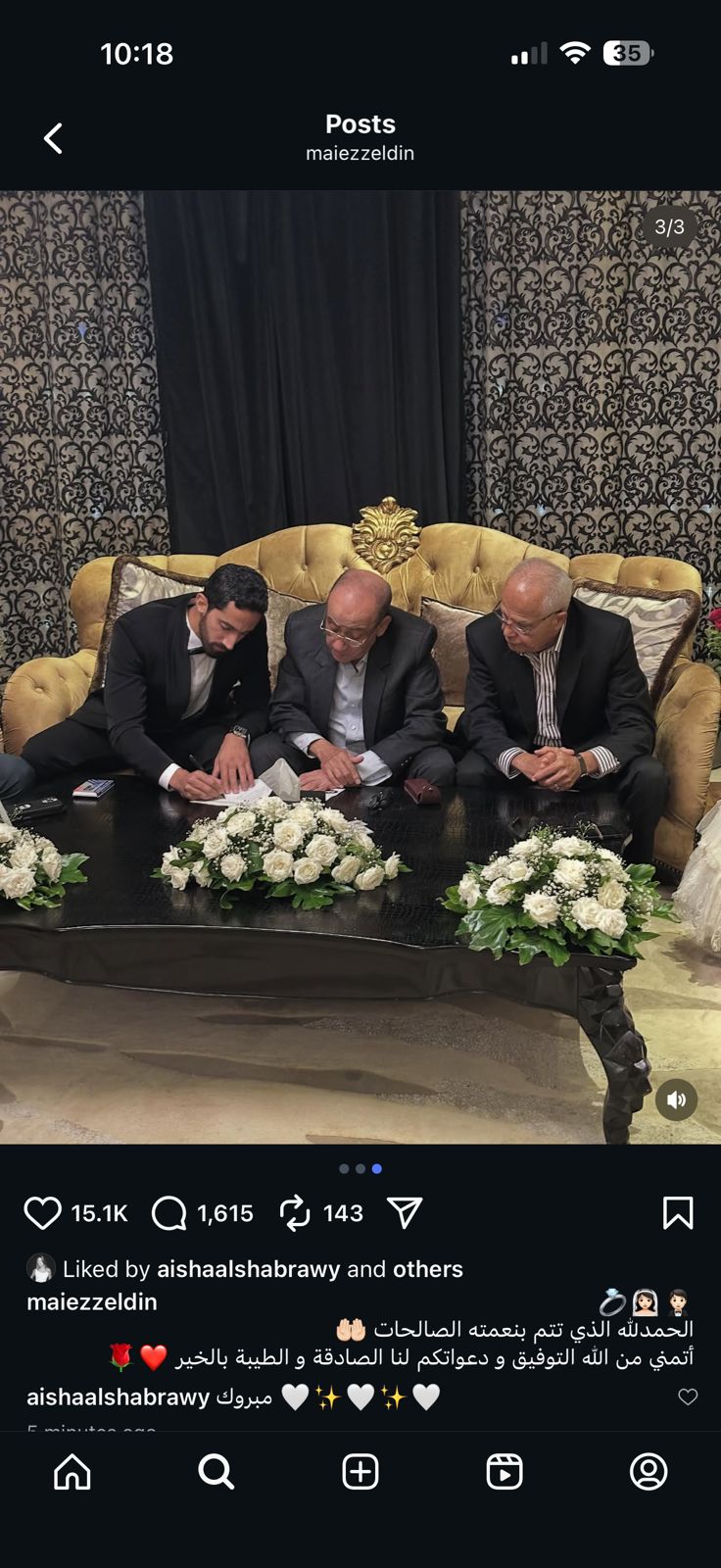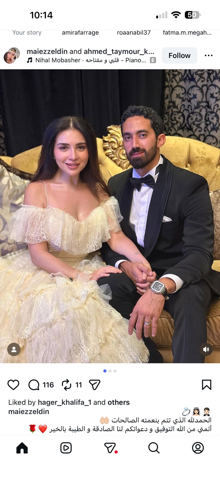أعلنت النجمة مي عز الدين زواجها ونشرت صورة لها من حفل الزفاف عبر حسابها بموقع انستجرام، وكتبت: الحمد لله الذي تتم بنعمته الصالحات، أتمنى من الله التوفيق ودعواتكم لنا الصادقة والطيبة بالخير.