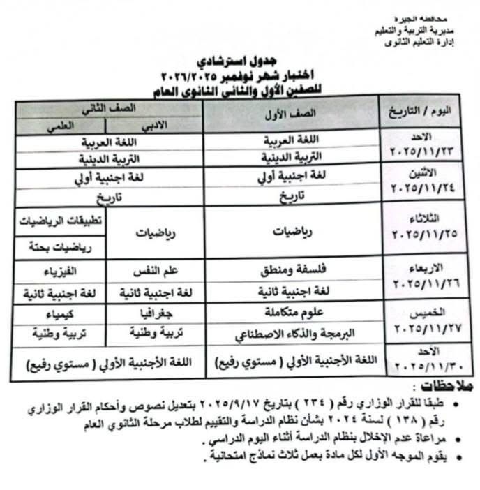جدول امتحان شهر نوفمبر لطلاب ابتدائى وإعدادى وثانوى فى الجيزة