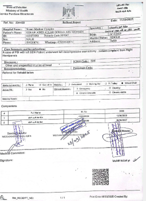 وأضافت أنها حصلت على تحويلة طبية لسفر ابنها خارج القطاع للعلاج، بعدما أكد أطباء المستشفى أن التأخير في علاجه يتسبب في تدهور حالته الصحية بشكل كبير خاصة أنه يحتاج إلى علاج متطور، مشيرة إلى أنها لا تستطيع أن ترعى ابنها خاصة بعد استشهاد الزوج مما انقطع مصادر المال لديها، مما جعلها تعاني مثل باقي سكان غزة من المجاعة.