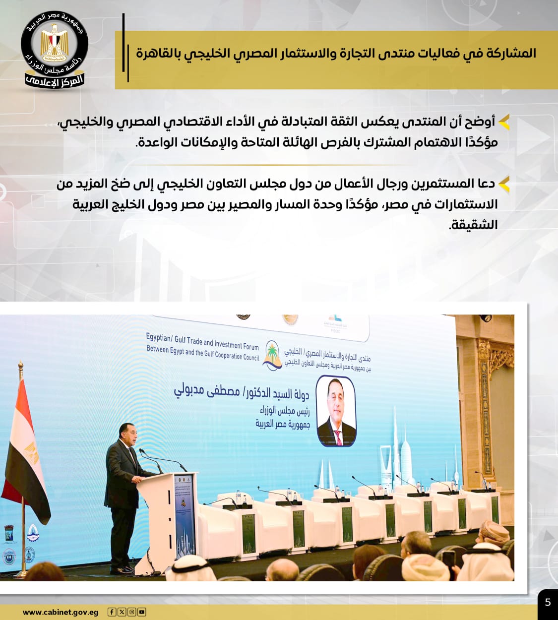 كما شارك رئيس الوزراء في فعاليات منتدى التجارة والاستثمار المصري الخليجي بالقاهرة، حيث أوضح سيادته أن المنتدى يعكس الثقة المتبادلة في أداء الاقتصاد المصري والخليجي، مؤكدًا الاهتمام المشترك بالفرص الهائلة المتاحة والإمكانات الواعدة، كما دعا المستثمرين ورجال الأعمال من دول مجلس التعاون الخليجي إلى ضخ المزيد من الاستثمارات في مصر.