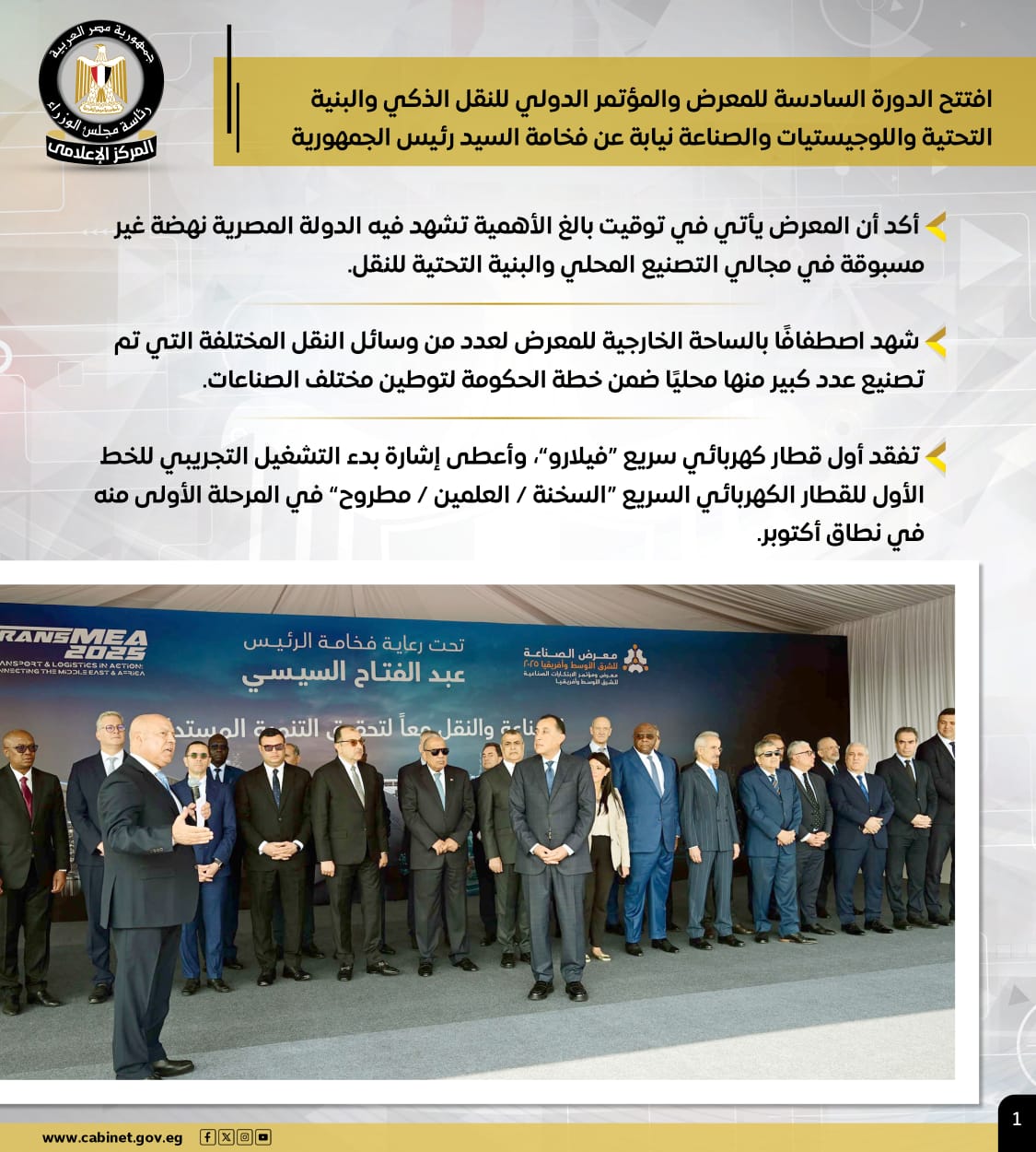 وتضمنت الأنشطة، افتتاح رئيس الوزراء الدورة السادسة للمعرض والمؤتمر الدولي للنقل الذكي والبنية التحتية واللوجستيات والصناعة نيابة عن السيد الرئيس عبد الفتاح السيسى، مؤكدًا أن المعرض يأتي في توقيت بالغ الأهمية تشهد فيه الدولة نهضة غير مسبوقة في مجالي التصنيع المحلي والبنية التحتية للنقل، حيث شهد سيادته اصطفافًا بالساحة الخارجية للمعرض لعدد من وسائل النقل المختلفة التي تم تصنيع عدد كبير منها محليًا.