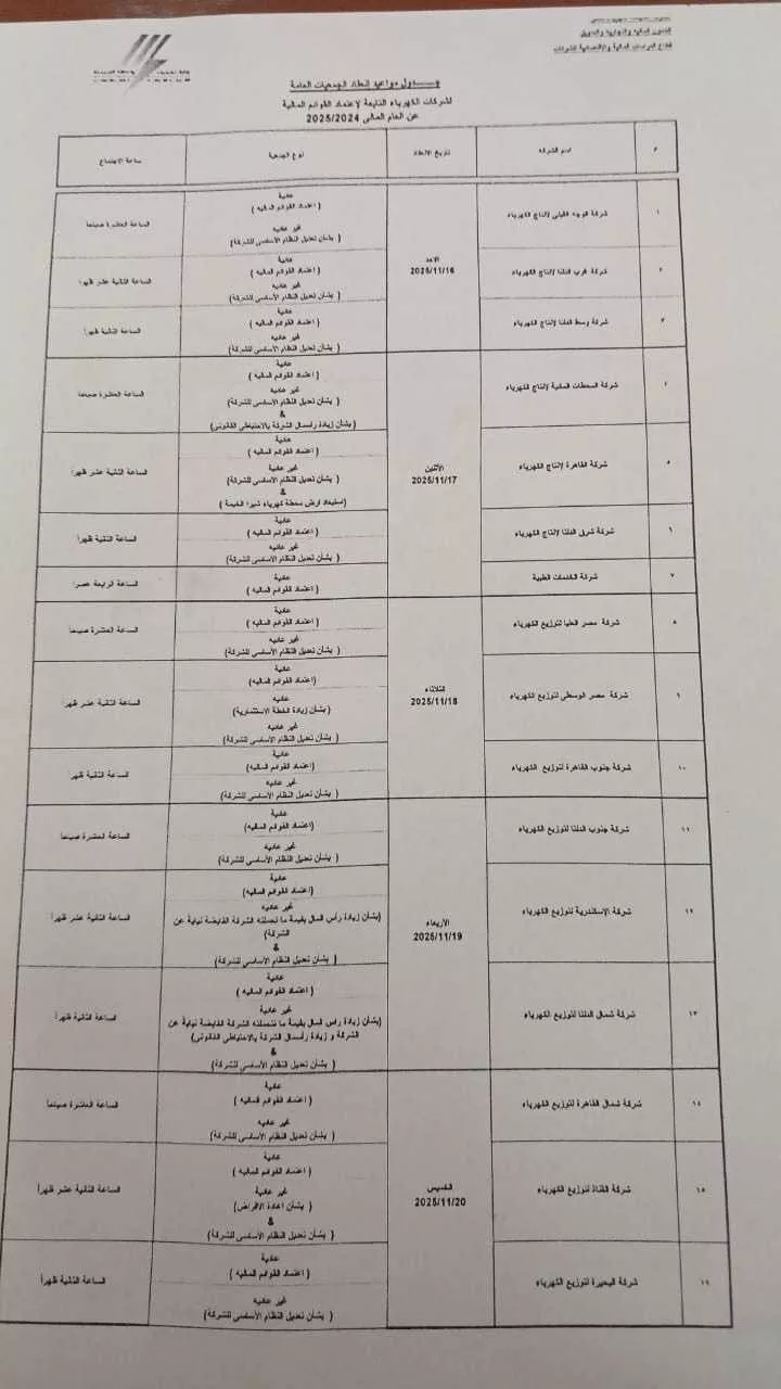وتبدأ الاجتماعات، حسب الجدول الرسمي، يوم الأحد 16 نوفمبر 2025 بعقد جمعيات شركات شرق الدلتا لإنتاج الكهرباء، وسط الدلتا لإنتاج الكهرباء، وغرب الدلتا لإنتاج الكهرباء، وشركة محطات خليج السويس لإنتاج الكهرباء، وتخصص جميعها لمناقشة واعتماد ميزانيات العام المالي الجديد.