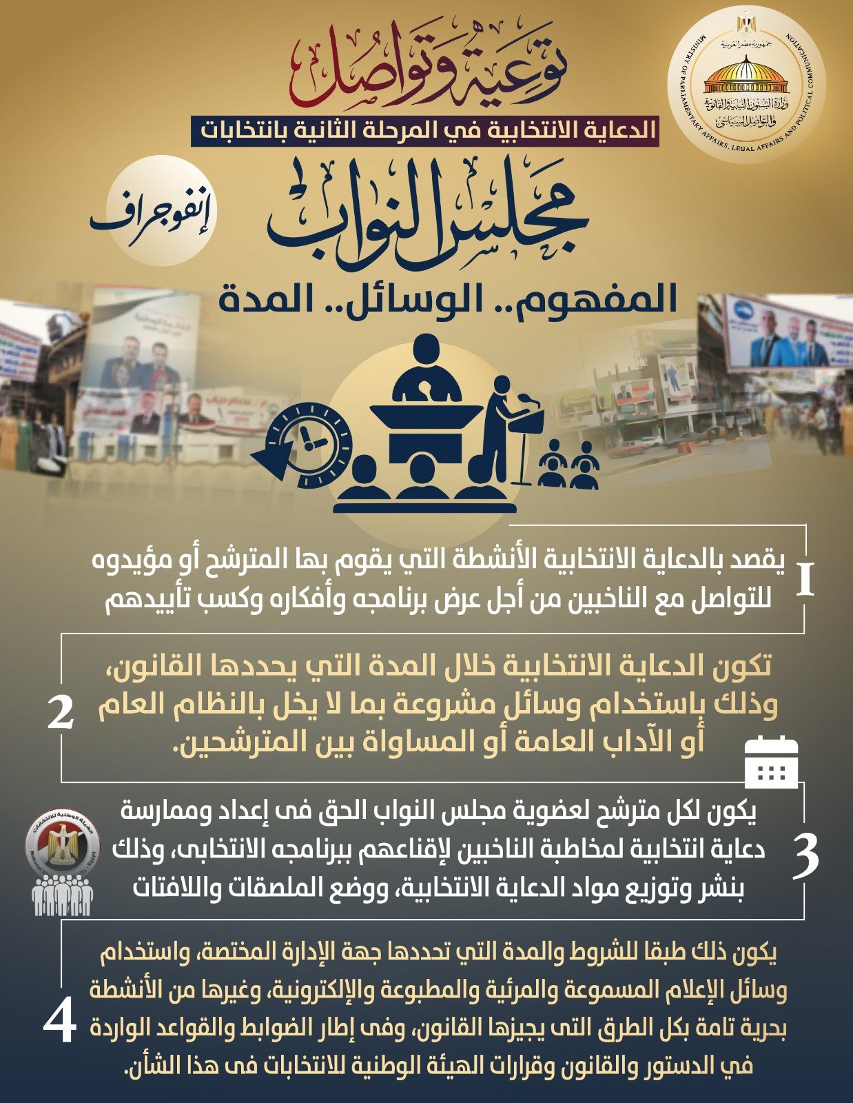 أصدرت وزارة الشؤون النيابية والقانونية والتواصل السياسي بيانًا اليوم السبت، قالت فيه إنه استمرارًا لسلسلة المحتوى التوعوي الذي بدأته الوزارة تحت شعار "توعية وتواصل"، نشرت مجموعة إنفوجرافات سياسية توعوية قدمت فيها معلومات عن الدعاية في المرحلة الثانية من انتخابات مجلس النواب، وجاءت المجموعة بعنوان " توعية وتواصل.. المرحلة الثانية من انتخابات مجلس النواب.. الدعاية الانتخابية.. المفهوم.. الوسائل.. المدة.. إنفوجراف".