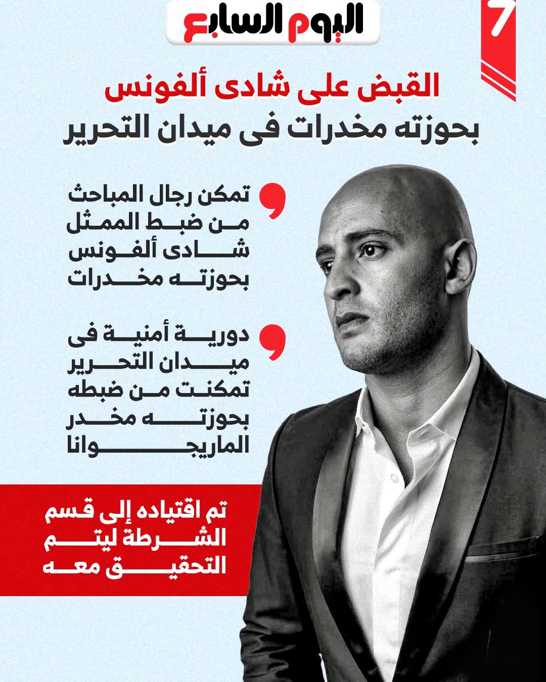 كانت دورية أمنية فى ميدان التحرير تمكنت فى ضبط الفنان الكوميدي شادي ألفونس وبحوزته مخدرات فتم التحفظ عليه لاتخاذ الإجراءات القانونية اللازمة.