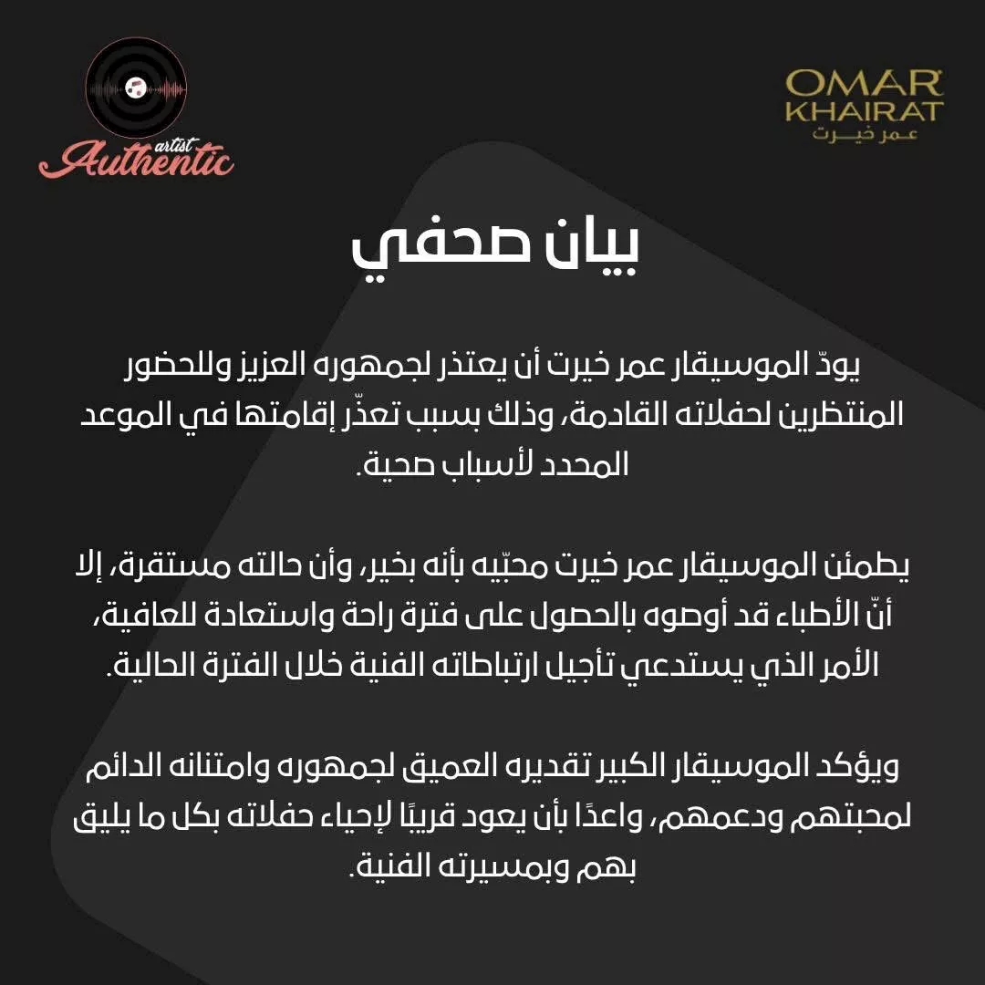 ونشرت الصفحة الرسمية للموسيقار الكبير بيان إعلامي جاء فيه: يود الموسيقار عمر خيرت أن يعتذر لجمهوره العزيز وللحضور المنتظرين لحفلاته القادمة، بسبب تعذّر إقامتها في الموعد المحدد لأسباب صحية.