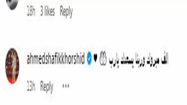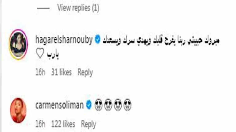وجاءت تعليقات الفنانين، كالتالي، حيث كتبت داليا البحيري "الله.. ربنا يحفظكم ويسعدكم يا رب". وكتبت إلهام شاهين"ربنا يسعدكم حبيبتي". ووضعت غادة عبدالرازق إيموجي "قلوب". وكتبت هاجر الشرنوبي "مبروك حبيبتي ربنا يفرح قلبك ويهدي سرك ويسعدك يا رب". وكتب المخرج أحمد شفيق "ألف مبروك وربنا يسعدك يا رب".