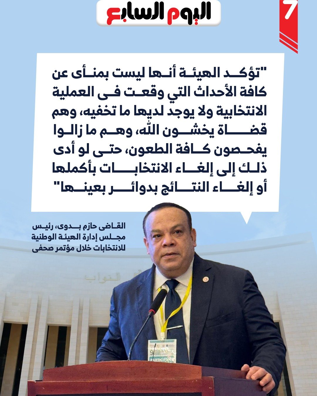 أكد القاضي حازم بدوى ، رئيس مجلس إدارة الهيئة الوطنية للانتخابات ، "أن الهيئة ليست بمنأى عن كافة الأحداث التي وقعت فى العملية الانتخابية ولا يوجد لديها ما تخفيه، وهم قضاة يخشون اللّه، وهم ما زالوا يفحصون كافة الطعون، حتى لو أدى ذلك إلى إلغاء الانتخابات بأكملها أو إلغاء النتائج بدوائر بعينها".