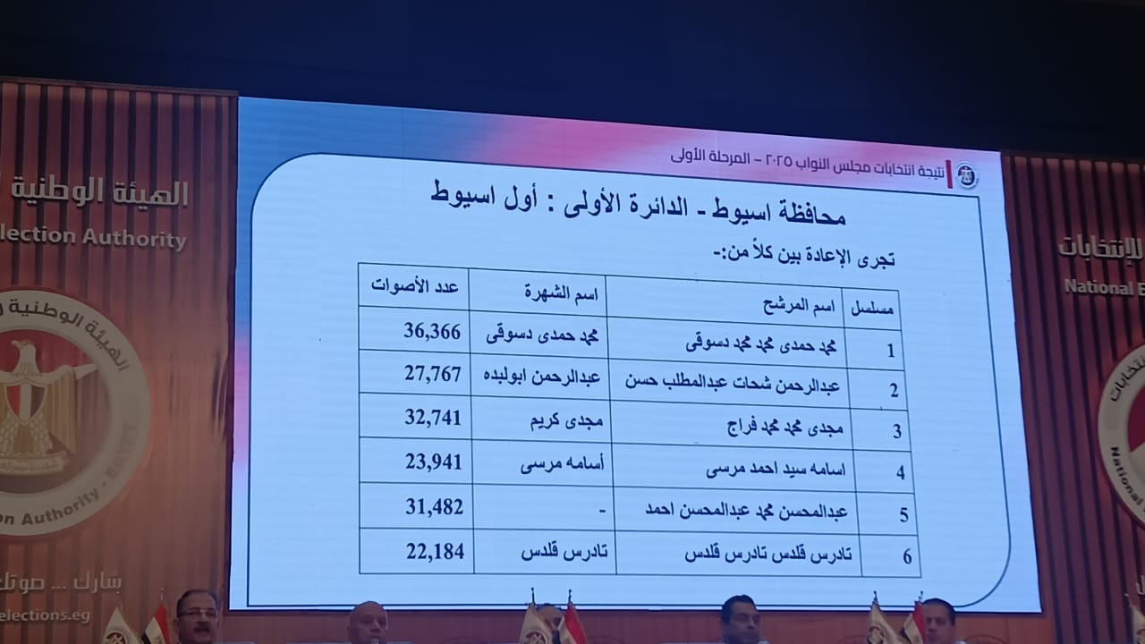 أعلنت الهيئة الوطنية للانتخابات إجراء جولة الإعادة بمحافظة أسيوط - الدائرة الأولى : أول أسيوط بانتخابات مجلس النواب بين كل من محمد حمدى دسوقى وعبد الرحمن أبو لبده ومجدي كريم وأسامة مرسى وعبد المحسن محمد عبد المحسن وتادرس قلدس تادرس.