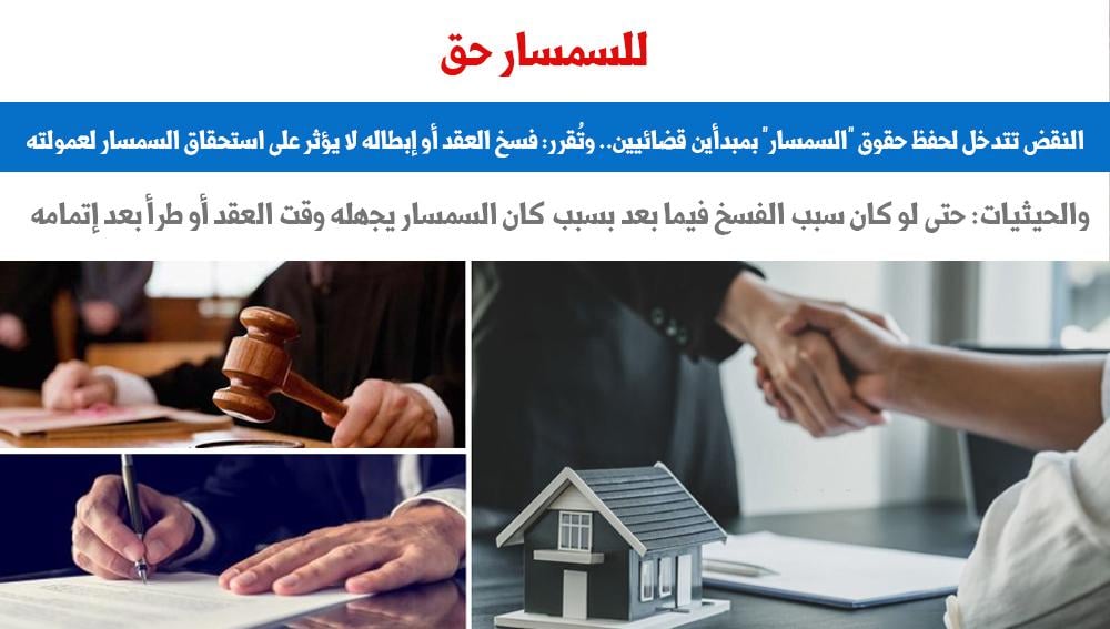 النقض تتدخل لحفظ حقوق "السمسار" بمبدأين قضائيين.. وتُقرر: فسخ العقد أو إبطاله لا يؤثر على استحقاق السمسار لعمولته.. والحيثيات: حتى لو كان سبب الفسخ فيما بعد بسبب كان السمسار يجهله وقت العقد أو طرأ بعد إتمامه
