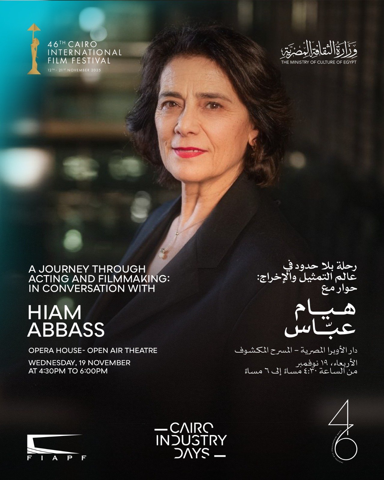 يقيم مهرجان القاهرة السينمائى الدولى في دورته الـ 46، جلسة حوارية مع الممثلة والكاتبة والمخرجة الفلسطينية هيام عباس ، - والتى تم تكريمها بحفل الافتتاح بمنحها جائزة الهرم الذهبي- اليوم الأربعاء في تمام الساعة الرابعة والنصف مساء، على المسرح المكشوف بدار الأوبرا المصرية، وتدير الندوة ناهد نصر.