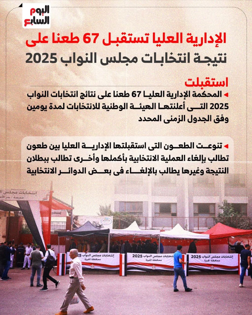 كشف إنفوجراف اليوم السابع تفاصيل الطعون الانتخابية التي استقبلتها المحكمة الإدارية العليا والتي بلغ عددها 67 طعنا على نتائج انتخابات مجلس النواب 2025 التي أعلنتها الهيئة الوطنية للانتخابات، وذلك لمدة يومين وفق الجدول الزمني المحدد من قبل الهيئة.