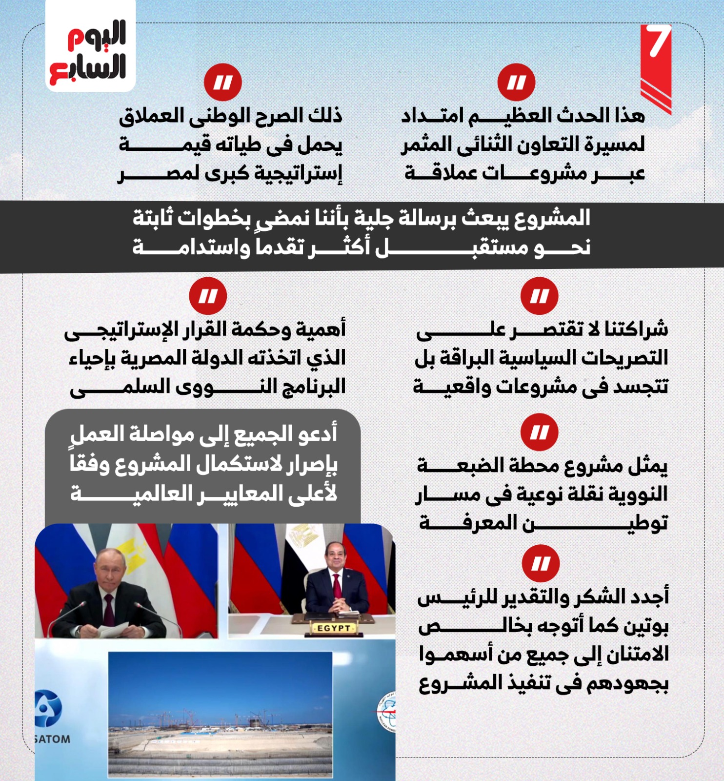 كما أوضح أن الكهرباء التي ستنتج عن محطة الضبعة النووية ستسهم في تعزيز أمن الطاقة في مصر، مشيراً إلى أن الشركة الروسية المنفذة تعتمد أحدث التقنيات التكنولوجية مع الالتزام الكامل بالمعايير البيئية، وأن الجانب الروسي يقدّم برامج تدريب وتأهيل للكوادر المصرية العاملة في المجال النووي، مع إمكانية توظيف العلوم والتكنولوجيا النووية كذلك في مجالات على غرار الطب والزراعة. واختتم الرئيس بوتين كلمته بتوجيه الشكر للعاملين في مشروع محطة الضبعة النووية من الجانبين المصري والروسي، مهنئاً مصر بعيد الطاقة النووية الخامس، ومعاوداً تقديم التهنئة للرئيس بمناسبة يوم مولده.
