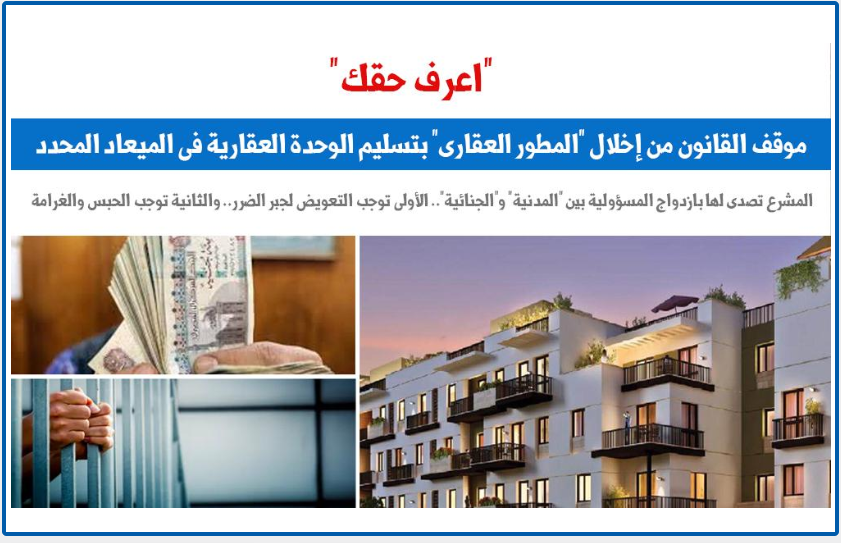 والنقض تتصدى للأزمة وتعتبر "الوحدة العقارية" سلعة.. موقف القانون من إخلال "المطور العقارى" بتسليم الوحدة العقارية فى الميعاد المحدد.. المشرع تصدى لها بازدواج المسؤولية بين "المدنية" و"الجنائية".. الأولى توجب التعويض لجبر الضرر.. والثانية توجب الحبس والغرامة