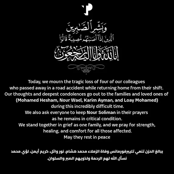 وفي بيان نعي عبر حساب الشركة على موقع التواصل الاجتماعي "فيسبوك"، أعربت الشركة عن حزنها الشديد لفقدان 4 من موظفيها وهم "محمد هشام، نور وائل، كريم أيمن، لؤي محمد".