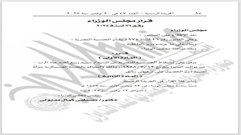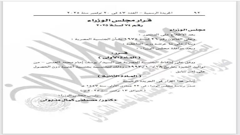 أصدر الدكتور مصطفى مدبولي، رئيس الوزراء، قرار بإسقاط الجنسية المصرية عن 3 أشخاص.