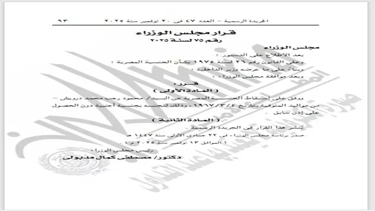 وقرر مدبولي إسقاط الجنسية عن محمود رجب محمد درويش - من مواليد المنوفية بتاريخ ١٩٦٧/٣/٤، وذلك لتجنسه بجنسية أجنبية دون الحصول على إذن مسبق.