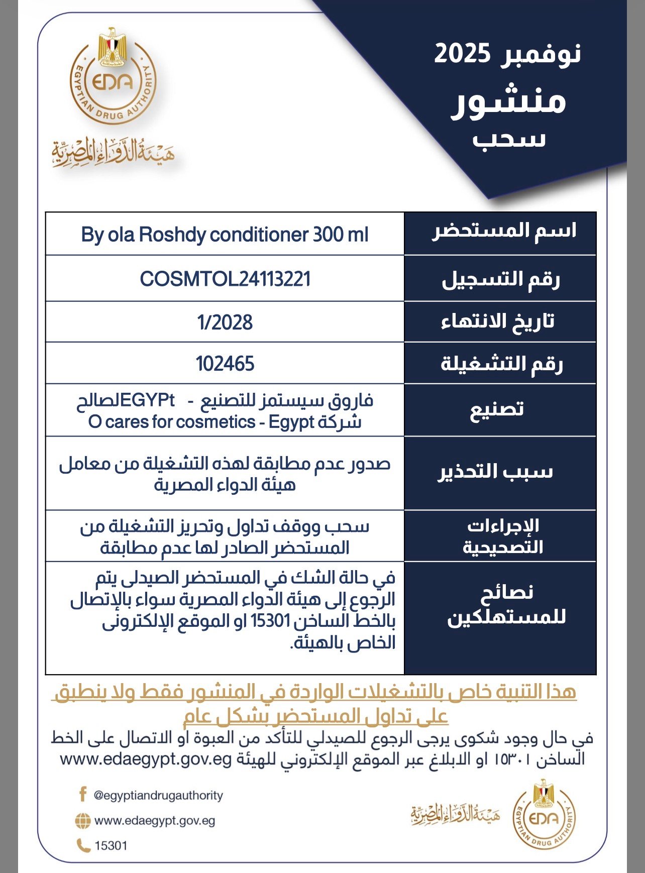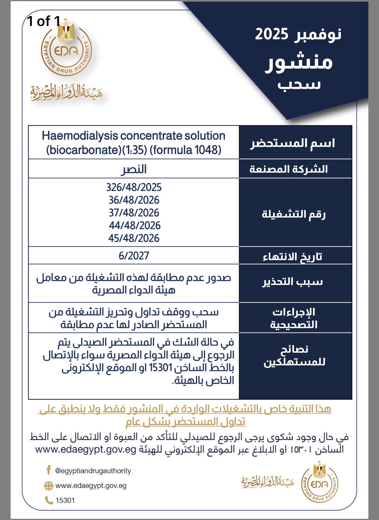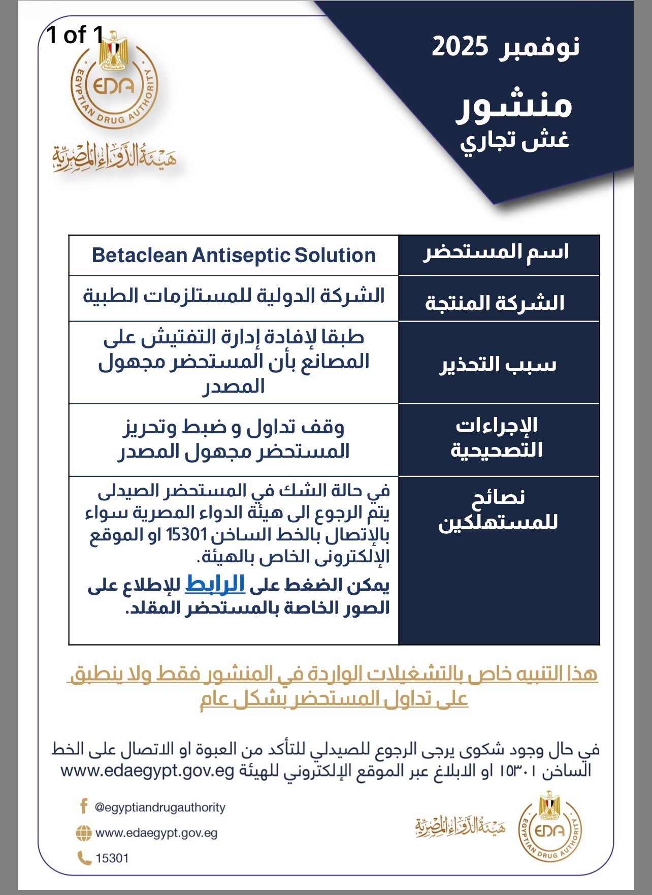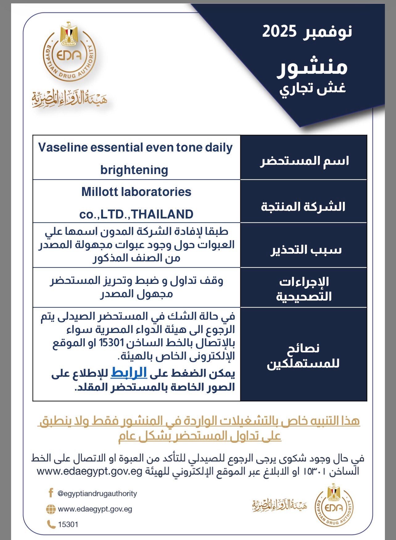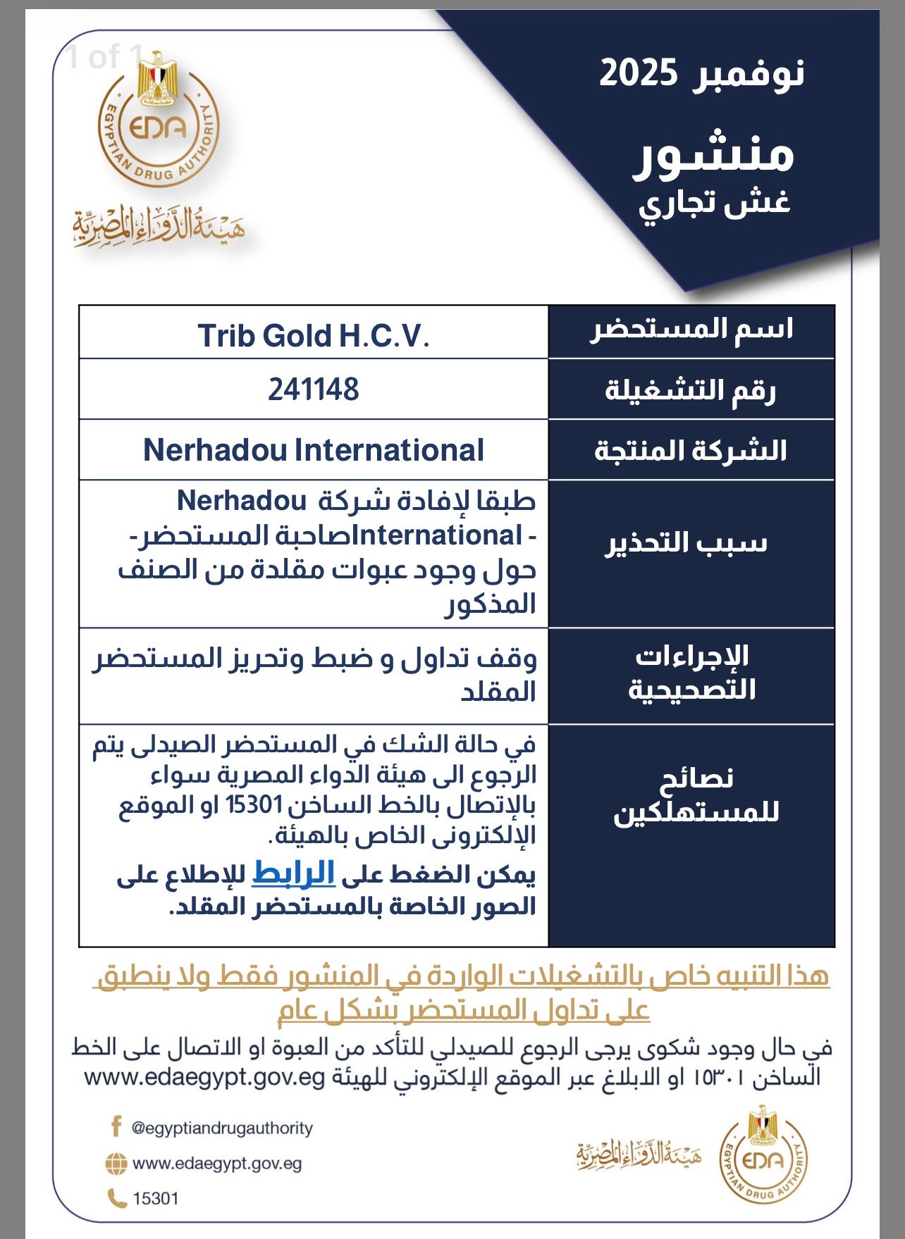 وقالت هيئة الدواء : يتم وقف تداول وضبط وتحريز العبوات مجهولة المصدر من المستحضرات وفي حالة الشك في المستحضر الصيدلي يتم الرجوع الى الهيئة سواء بالإتصال بالخط الساخن 15301 أو الموقع الإلكتروني الخاص بالهيئة.